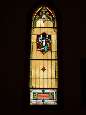 What a darling little place! Beautiful windows, pews that appeared original. The chancel had obviously been updated. The altar, lectern, and pulpit appeared to be, oh, 1960's, give or take a decade. But it still fits in well and isn't at all out of place, even though I couldn't help but wonder why the original furnishings were replaced at that time ...